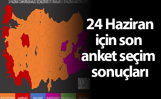 Ada Şirketi’nin açıkladığı 24 Haziran seçim anketi sonuçlarına göre Recep Tayyip Erdoğan ilk turda yüzde 50,1, Muharrem İnce %28,4, Meral Akşener yüzde 10,3, Selahattin Demirtaş ise yüzde 9,8 oy alacak.