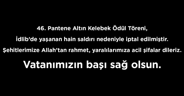 Hürriyet ve P&G tarafından düzenlenen, 28 Şubat’ta yapılması planlanan 46. Pantene Altın Kelebek Ödül Töreni’nin iptaliyle ilgili, “İdlib’de yaşanan hain saldırı nedeniyle törenimiz iptal edilmiştir. Şehitlerimize Allah’tan rahmet, yaralılarımıza acil şifalar dileriz” açıklaması yapıldı.