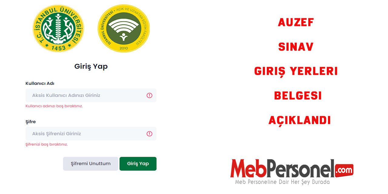 İstanbul üniversitesi açık uzaktan eğitim fakültesi AUZEF ara sınav giriş yerleri belgesi erişime açıldı. AUZEF tarafından yapılan açıklamada 13-14 Kasım’da icra edilecek olan ara sınavlara ait AUZEF sınav giriş yerleri belgelerinin http://auzefsinav.istanbul.edu.tr internet sitesinden AKSİS kullanıcı adı ve şifre ile erişim sağlanacağı ilan edildi.