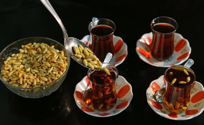 İZMİR (AA) – ONUR CENGİZ – Türk mutfağında helva, iç pilav gibi yemeklerde kullanılan çam fıstığı, en önemli üretim merkezi olan Bergama’nın Kozak Yaylası’ndaki köylerde çayın içine atılarak tüketiliyor. Yöredeki köylerde “cilveli çay” geleneği, yükselen çam fıstığı fiyatlarına rağmen devam ettiriliyor.