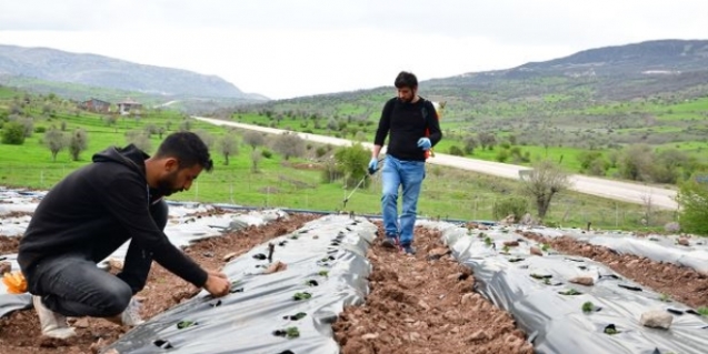 Bu süreyi fırsata çeviren Ceylan, kuzeni Tekler ile Güzelyurt köyündeki 4 dönüm arazi üzerine 8 bin çilek fidesini toprakla buluşturdu.