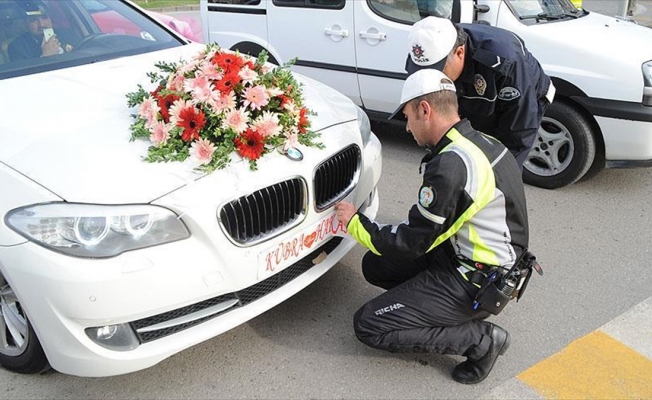 Plakayı kapatan kağıdı çıkaran polis, çifte mutluluk diledikten sonra aracın ayrılmasına izin verdi.