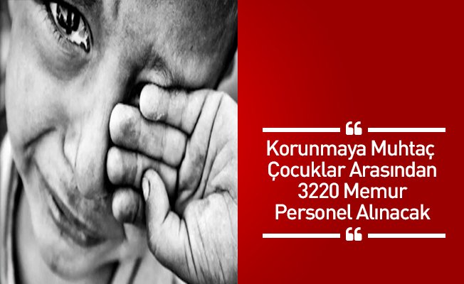 Korunmaya muhtaç çocuklar arasından 3220 memur alımı yapılacak. Başvurular 30 Aralık 2016- 13 Ocak 2017 tarihleri arasında e-devlet üzerinden yapılacak. Başvuru kılavuzu 30 Aralık 2016 tarihinde Devlet Personel Başkanlığı tarafından yayınlanacak.
