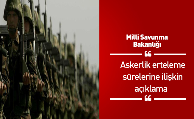 Milli Savunma Bakanlığı, askerlik erteleme süreleri ile ilgili, “Üniversiteler tarafından kimlikleri bildirilen yükümlülerin askerlikleri 2 senelik öğrenim süresi için 4 yıl, 4 senelik öğrenim süresi için 7 yıl, 6 senelik öğrenim süresi için 9 yıl olarak okula ilk kayıt yaptırdıkları yıldan itibaren ertelenebilmektedir” açıklamasını yaptı.