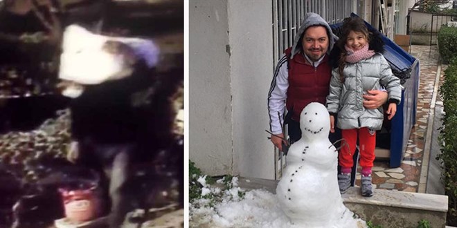 İstanbul’da kar yağışının artmasıyla birlikte Kartal’da yaşayan Akbaş ailesi 5 yaşındaki kızlarının isteğini kırmayarak kartopu oynadıktan sonra araçların üzerindeki karları toplayarak kardan adam yaptı.