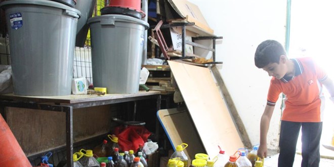 Öğrenciler, atık yağ, kağıt ve plastikleri geri dönüşüm deposunda topluyor. Tonlarca ağırlığa ulaşan atıklar geri dönüşüm firmaları tarafından ücreti karşılığında satın alınıyor.