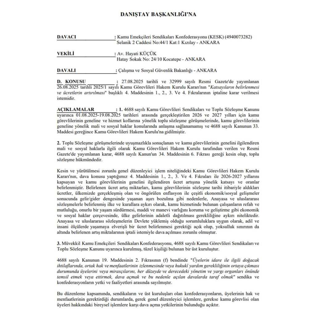 Kamu Emeklileri Sendikaları Konfederasyonu (KESK), 27 Ağustos 2025 tarihli Resmî Gazete’de yayımlanan ve 2026-2027 yıllarını kapsayan 2025/1 Sayılı Kamu Görevlileri Hakem Kurulu Kararı’na karşı yargı sürecini başlattı. KESK, davalı olarak Çalışma ve Sosyal Güvenlik Bakanlığı’nı göstererek, Karar’ın özellikle memur maaş ve ücretlerinin artırılmasına ilişkin hükümlerinin iptali için dava açtı.