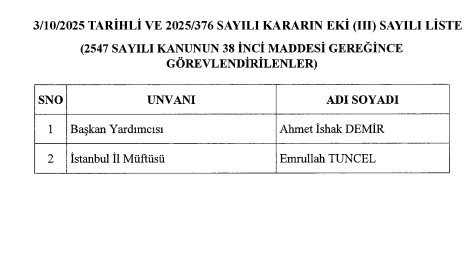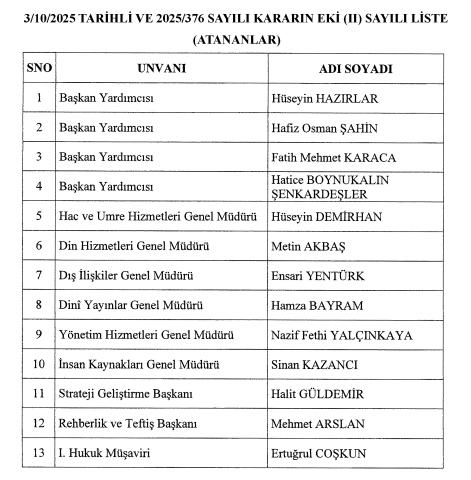 3 sayılı Cumhurbaşkanlığı Kararnamesinin 2, 3 ve 4 üncü maddeleri ile 2547 sayılı Yükseköğretim Kanununun 38 inci maddesi gereğince ekli (I) sayılı listede yer alan Diyanet İşleri Başkanlığı üst kademe kamu yöneticileri görevden alınmış, ekli (II) sayılı listede yer alan üst kademe kamu yöneticiliklerine hizalarında belirtilen kişiler atanmış ve ekli (III) sayılı listede yer alan üst kademe kamu yöneticiliklerine hizalarında belirtilen kişiler görevlendirilmiştir.