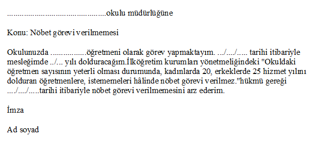 Öğretmenler İçin Nöbet Muafiyet Dilekçe Örneği