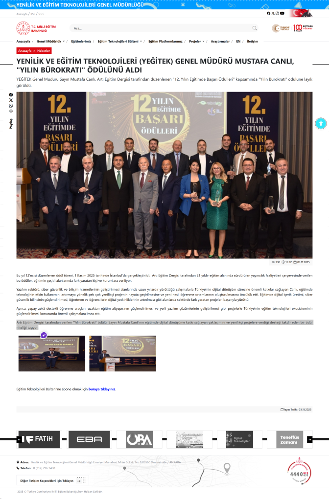 Artı Eğitim Dergisi tarafından verilen “Yılın Bürokratı” ödülü, Mustafa Canlı’nın eğitimde dijital dönüşüme katkı sağlayan yaklaşımını ve yenilikçi projelere verdiği desteği takdir eden bir ödül niteliği taşıyor.