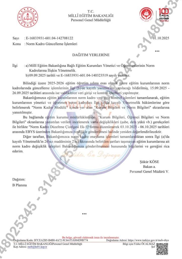 Milli Eğitim Bakanlığı Personel Genel Müdürlüğü, 2025-2026 eğitim öğretim yılına hazırlık amacıyla eğitim kurumlarının norm kadrolarında güncelleme yapılacağını duyurdu. Bakanlık tarafından gönderilen Resmi Yazı’da önemli ifadeler yer aldı. Detaylar şu şekilde…
