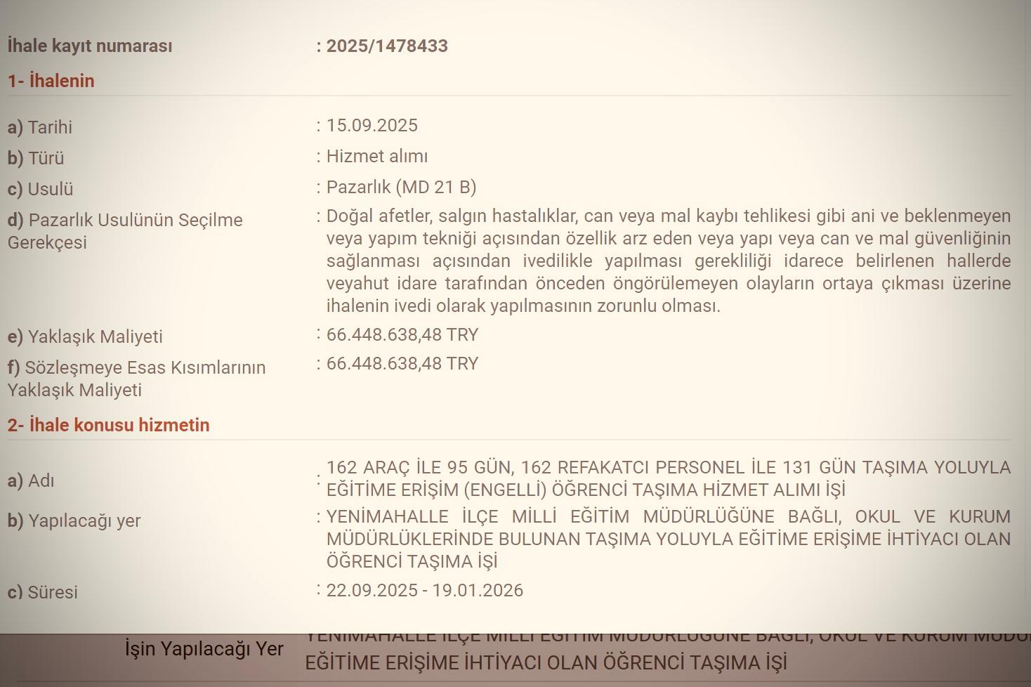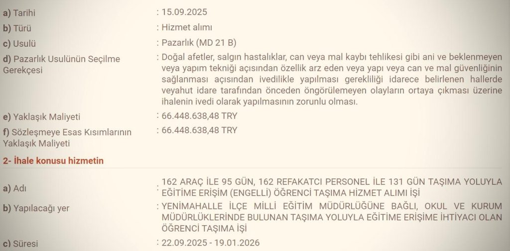 Ankara Yenimahalle İlçe Millî Eğitim Müdürlüğü’nün 2025 yılı özel eğitim öğrenci taşıma ihalesinde kamu zararı oluştuğuna dair iddialar şu şekildedir ve bu iddialara karşı cevap beklenmektedir: