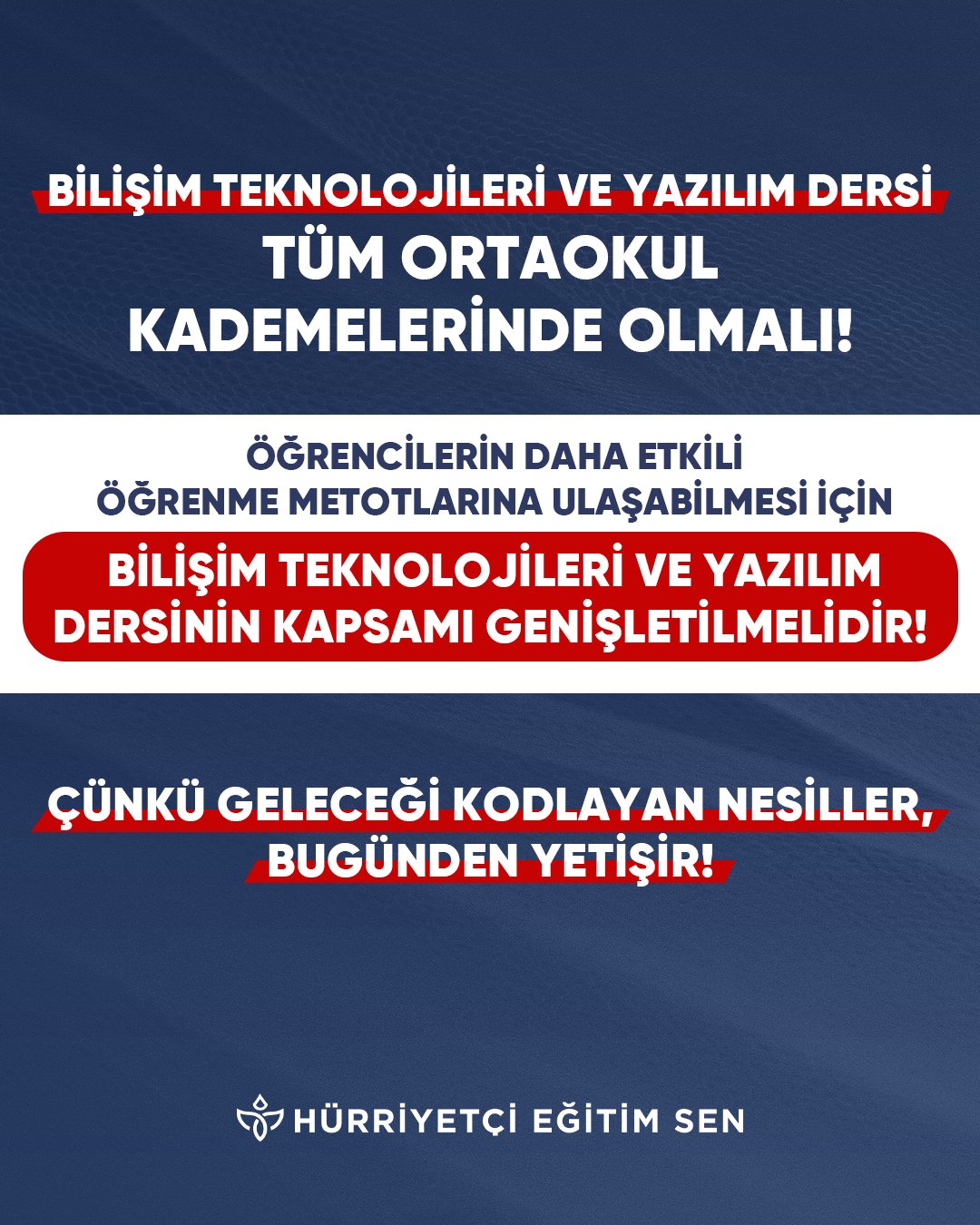Hürriyetçi Eğitim Sen öğrencilerin daha etkili öğrenme metotlarını ulaşabilmesi için ortaokulda tüm kademelerde “Bilişim Teknolojileri ve Yazılım Dersi” eklenmeli çağrısında bulundu.