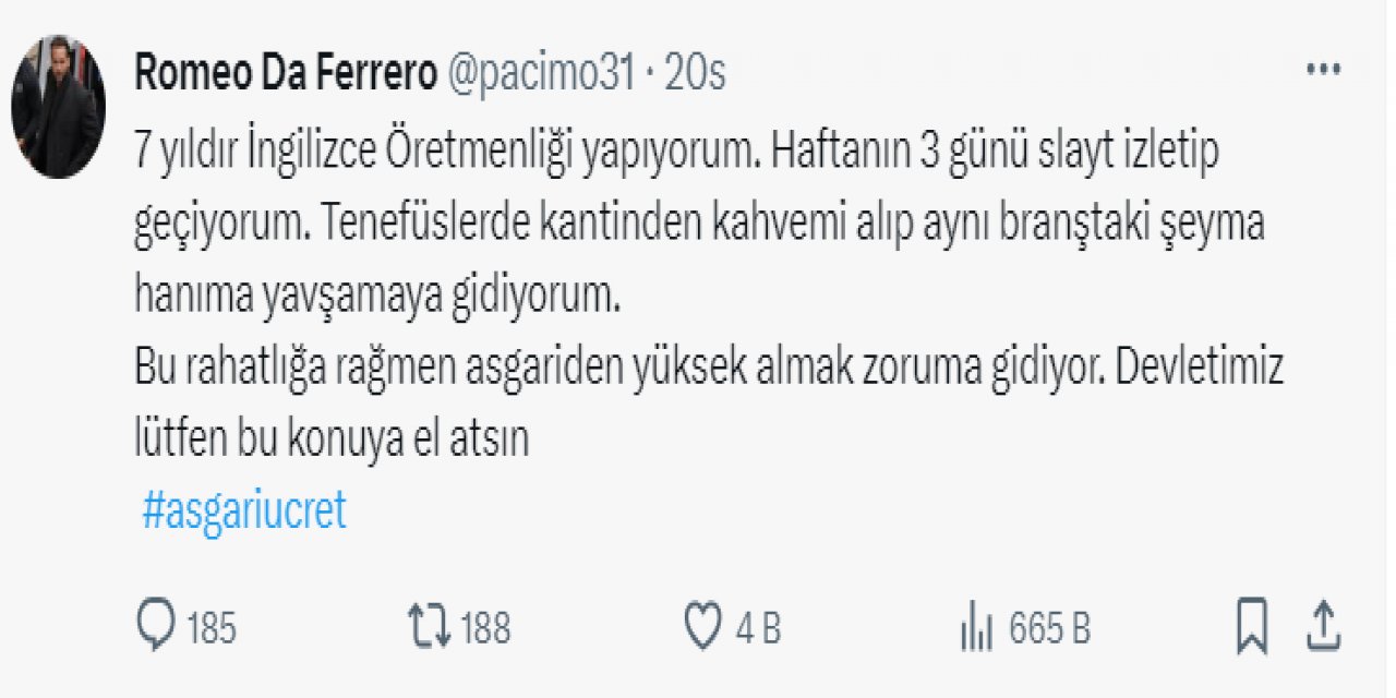 Sizin yaptığiniz haber kesinlikle kötü niyetli. Bu kişinin ciddiye alınmaması gerektiği ortada , siz ise böyle bir paylaşımın öğretmenlik mesleğini mağdur edeceğini söylüyorsunuz. Ben kişiye değil, sizin yaklasiminiza kızdım. Hakkımızda böyle düşünülüyorsa, insanlar buna inanacaklarsa okulları kapatsinlar zaten . Bununla birlikte herkes için insanca yaşayabileceği ücret olmalı . Asgari ücretli de emek veriyor, doktor da, öğretmen de… Mesleğini iyi yapıp yapmamak ise kişisel ahlak ile ilgili