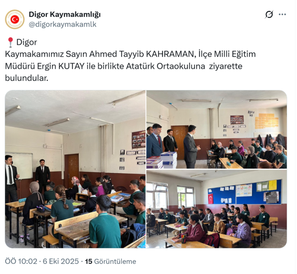 Kars’ın Digor ilçesinde Kaymakam Ahmed Tayyib Kahraman ve İlçe Millî Eğitim Müdürü Ergin Kutay’ın Atatürk Ortaokulu ziyaretine ilişkin Kaymakamlık sosyal medya hesabından yapılan paylaşım dikkat çekti.