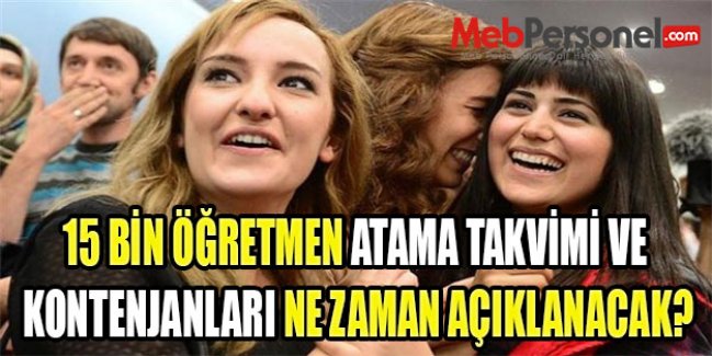 MEB kaynaklarından edindiğimiz bilgilere göre; 15 bin atama için Meclis’ten atama izninin çıkması bekleniyor. MEB, bu izni elden takip ediyor ve izin resmi olarak çıkar çıkmaz MEB de atamayla ilgili duyuruya çıkacak. Meclis, 6 Ocak 2015 gününden itibaren çalışmalarını devam ettirecek. Yani 6 Ocak 2015 tarihinden itibaren Cuma gününe kadar atama izninin çıkması ve atamalarla ilgili duyuru yapılması bekleniyor.