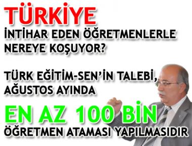 Öğretmenler büyük bir hevesle Ağustos ayında yapılacak atamaları beklemektedir. Buradan Milli Eğitim Bakanı Ömer Dinçer’e çağrıda buluyoruz: Sayın Dinçer bir kere de öğretmenler için hayırlı bir iş yap. Atama bekleyen öğretmenlere kapılarını kapatma. TÜRK EĞİTİM-SEN OLARAK TALEBİMİZ, AĞUSTOS AYINDA EN AZ 100 BİN ATAMA YAPILMASIDIR. Bakan Dinçer bilmelidir ki; 10 bin, 20 bin atama, ne atama bekleyen öğretmenleri tatmin eder, ne de 130 bin öğretmen açığını giderir. Bu nedenle Bakan Dinçer, Sayın Başbakan’a olayın vahametini tüm gerçekliğiyle anlatmalı ve 100 bin öğretmen ataması yapılmasını mutlaka sağlamalıdır.