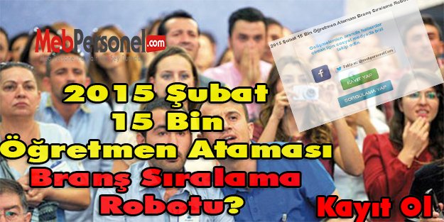 Meb Şubat’ta 15 bin öğretmen ataması yapacak. mebpersonel.net sitesi tarafından siz değerli öğretmenler için hazırlamış olduğumuz 22015 Şubat Öğretmen Ataması Branş Sıralama Robotu sayesinde Kpss Puanınızı sisteme girerek oluşacak veri merkezinde oluşacak puanlara göre kendi alanınıza ait olan sıralamanızı öğrenebileceksiniz.