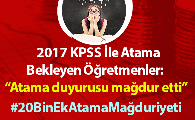 2017 KPSS İle Atama Bekleyen Öğretmenler: Atama duyurusu mağdur etti. 20 bin öğretmen ataması takvimi açıklandı. Takvime göre Milli Eğitim Bakanlığı atamaları 2017-2018 KPSS puanları ile başvuruları alarak yapacak. 2017 KPSS ile ek atama bekleyen adayları bu duyuru memnun etmemiş gibi gözüküyor.
