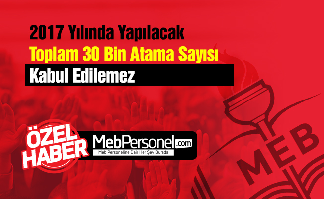 2017 yılında toplam 30 bin atama yapılacak olması kabul edilebilir bir sayı değildir. Mebpersonel.com olarak şimdiden bu konuda MEB’i ve hükümeti uyarıyoruz.