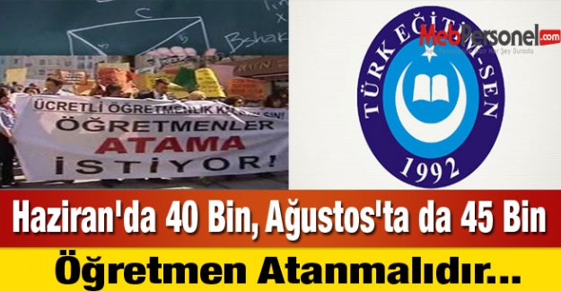 Milli Eğitim Bakanlığı 2014 yılında 50 bin öğretmen ataması gerçekleştirmiştir. Biz bu süreçte 100 bin atama yapılması için kanun teklifi hazırlayarak, muhalefet partilerine gönderdik. Ancak bu talebimiz gerçekleşmedi. Bakanlık Şubat ayında da 15 bin ek öğretmen ataması yapacağını açıklamıştır. Bu atama ne ülkemizin öğretmen ihtiyacına ne de atama bekleyen öğretmenlerin beklentilerine uygun olacaktır. Türk Eğitim-Sen 100 bin öğretmen atama talebinde ısrarcıdır ve bu talebin gerekçeleri de çok makuldür. Şöyle ki;