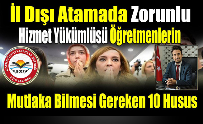 Bilindiği üzere 5 ila 8 haziran 2018 tarihleri arasında il dışı atama başvuruları alınacak.İl dışı atama başvurularıyla ilgili olarak kafalarda tereddüt kalmayacak şekilde il dışı atamayla ilgili 38 soru ve cevabını 2 haziranda yayımladığım makalemde kamuoyuyla paylaşmıştım.İçlerinden bazıları ise özellikle bazı kısım öğretmenler için ayrıca vurgulanması gerekiyor ki bunlardan bir tanesi zorunlu hizmet yükümlüsü olan öğretmenlerin il dışı atama başvurusunda bulunurken dikkat edilmesi gereken hususlar olarak nitelendirebiliriz.