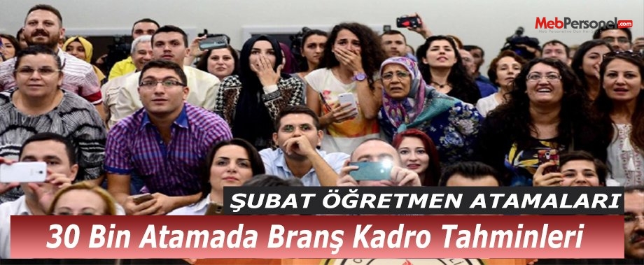 2016 Şubat ayı  Öğretmen Atamaları Kadroları Netleşiyor-İşte Yeni Tahmin- Öğretmen Atamaları Kadroları -2016 Şubat Ataması için  Tahmini Dağılım. Şubat ayı öğretmen atamalarına sadece 30 gün kaldı. Öğretmen atamaları için branş kontenjan dağılımlarının Ocak ayının 3. haftası MEB-İKGM den ilan edilmesi bekleniyor. Şubat ayında yapılacak olan Öğretmen atamaları için başvurular ise Ocak ayının son haftası MEB-BİS üzerinden ilan edilecek.