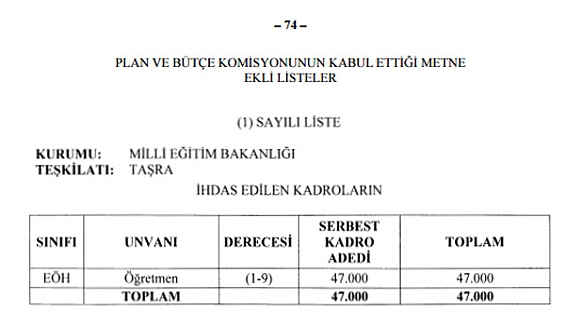 Aşağıda kabul edilen ilk iki madde bulunmaktadır. İlk madde ile 47 bin öğretmen kadrosu ihdas edilmiş, ikinci madde ile atama izni sayısı düzenlenmiştir. İkinci maddeyle ek olarak 37 bin atama izni daha verilmiştir. Meclise daha önce sunulan kanun teklifinde yer alan düzenlemeler gereğince, 37 bin atama izninin 35 bini öğretmen alımına yönelik olacaktır.