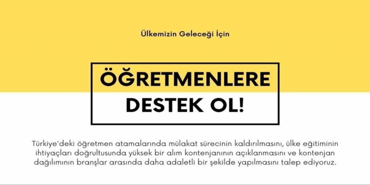 “Türkiye’deki öğretmen atamalarında mülakat sürecinin kaldırılmasını, ülke eğitiminin ihtiyaçları doğrultusunda yüksek bir alım kontenjanının açıklanmasını ve kontenjan dağılımının branşlar arasında daha adaletli bir şekilde yapılmasını Millî Eğitim Bakanlığı (MEB) yetkililerinden talep ediyoruz. Ülkemizde her yıl nüfusun artması ve okullaşma oranının istenilen düzeye ulaşmaması nedeni ile ciddi bir öğretmen açığı bulunmaktadır.