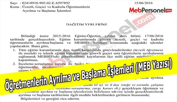 Ücretli, Geçici ve Kadrolu Öğretmenlerin Ayrılma ve Başlama İşlemleri İle İlgili Yazı Mebpersonel.com’da.