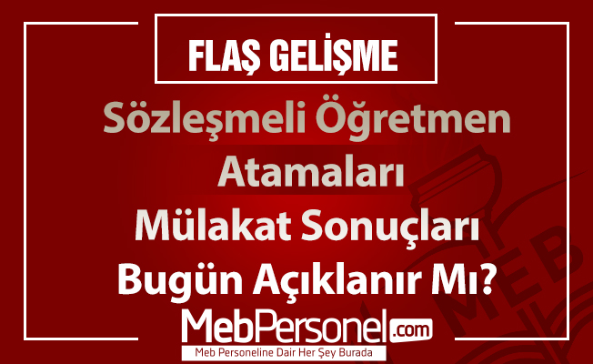 Sözleşmeli Öğretmen Atamaları Mülakat Sonuçları Bugün Açıklanır Mı? 20 bin öğretmen ataması mülakat sonuçlarının açıklanması bekleniyor. Son gelen bilgilere göre öğretmen atamaları mülakat sonuçları bir değişiklik ve olağanüstü bir durum olmaz bugün 16:00’dan sonra açıklanacak. Sözleşmeli öğretmen atamaları mülakat sonuçları açıklanır açıklanmaz mebpersonel.net olarak siz okurlarımıza haberi anlık olarak duyuracağız. Sözleşmeli öğretmen atamaları mülakat sonuçları meb.gov.tr adresi üzerinden mülakata giren 60 bin adayın erişimine açılacak.