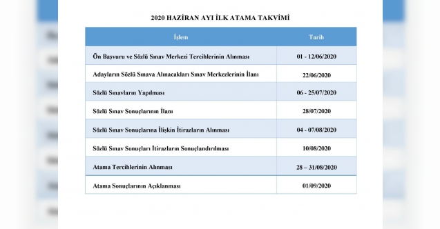 Milli Eğitim Bakanlığınca ataması yapılacak sözleşmeli öğretmen kadrosu için başvurular 1 Haziran’da başlayacak. Başvurular elektronik ortamda “https://ilkatama.meb.gov.tr” adresinden alınacak. Bakanlık, 19 bin 910 sözleşmeli öğretmen kadrosu için ön başvuru ve sözlü sınav merkezi tercihlerini 1 Haziran’dan itibaren 12 Haziran’a kadar alacak. Adayların sözlü sınava alınacakları sınav merkezleri 22 Haziran’da ilan edilecek. Sözlü sınavlar, 6-25 Temmuz’da yapılacak. Sözlü sınav sonuçları ise 28 Temmuz’da ilan edilecek. Bu kapsamda sonuçlara itirazlar, 4-7 Ağustos’ta alınacak. Bu itirazların sonuçları, 10 Ağustos’ta duyurulacak. Atama tercihleri, 28-31 Ağustos’ta alınacak, atama sonuçları ise 1 Eylül’de açıklanacak.