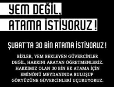 Ataması bakanlıklarca engellenen yüz binlerce öğretmenin her zaman yanında olduk, yine olacağız. 14 Ekim Pazar Günü Saat: 13:00’de Şubat döneminde 30.000 atama talebiyle alanda olacak “öğretmenlerimize” destek verecek, yanlarında olacağız. Eğitimi önemseyen, öğretmene saygı duyan herkesi bu güvercinli eyleme çağırıyoruz.