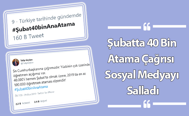 Şubatta 40 Bin Öğretmen Ataması Çağrısı Sosyal Medyayı Salladı. Atama bekleyen öğretmenlerin Türk Eğitim Sen öncülüğünde başlattıkları hashtag sosyal medyayı salladı. 150 binden fazla tweet paylaşımı yapılan #Şubat40binAnaAtama hashtagi sosyal medya paylaşım sitesi twitterdan gündem olarak rekor kırdı. Türk Eğitim Sen Genel Başkanı Talip Geylan’ın tweeti ile başlayan hashtag kısa sürede Türkiye Twitter gündemine girdi ve rekor kırarak trend topic oldu. Bakan Selçuk’un önceki gün Şubat ataması için olumlu konuşmaları atama bekleyen öğretmenleri sevindirdi. Taleplerini sosyal medyada dile getiren öğretmen adayları, Salı Günü Ankara’da yine Türk Eğitim Sen’in de desteği ile basın açıklaması yapacak.