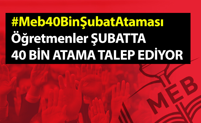 Atama bekleyen öğretmenlerin açtığı #Meb40BinŞubatAtaması twiterda gündeme oturdu. Etikete 70.000’den fazla tweet paylaşımı yapılarak rekor kırıldı. Atılan tweetlerde öğretmen adayları Şubat ayında yeni bir öğretmen ataması duyurusu beklediklerini belirtiyor. 144.000 öğretmen açığına vurgu yapan öğretmen adayları bu konuda Milli Eğitim Bakanlığının ana atama dönemi olan Şubat ayında yeni bir öğretmen ataması duyurusu yapılmasını talep ediyorlar.