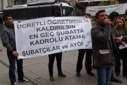 Eylemci öğretmenler, Taksim Meydanı’nda ‘Ücretli öğretmenlik kaldırılsın, en geç Şubat’ta kadrolu atama’ yazılı pankart açtı. Öğretmenler adına yapılan açıklamada, atanamayan öğretmen sayısının giderek arttığı dile getirildi. Milli Eğitim Bakanlığı ile hükümet yetkililerini göreve çağıran öğretmenler, belirli bir program dahilinde kademeli olarak koşulsuz atama yapılmasını talep etti.