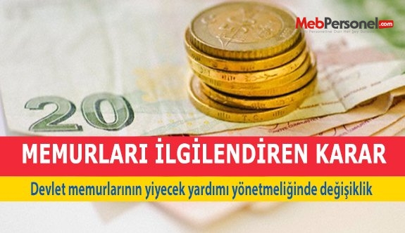 Resmi Gazete’de yayımlanan yönetmelik değişikliğiyle devlet memurlarının yiyecek yardımının gerektirdiği giderler, yemek maliyetlerinin Ankara, İstanbul ve İzmir illeri için üçte ikisini, diğer iller için yarısını aşmamak üzere yönetmelik kapsamındaki memur kadrosu adedine göre kurum bütçelerine konulacak ödeneklerle karşılanacak.