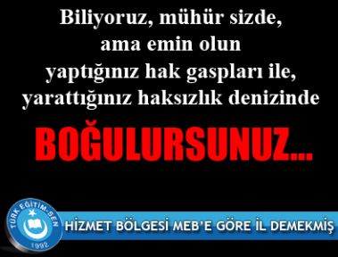Türk Eğitim Sen olarak tekrar söylüyoruz. Kılavuzla getirdiğiniz hakları, başka yöntemlerle tırpanlamayınız. Bu anlayış, zaten yıpranmış olan, MEB’e karşı güveni yerle bir edecektir. Bu kadar insanın ahını almayınız. Biliyoruz, mühür sizde, ama emin olun yaptığınız hak gaspları ile, yarattığınız haksızlık denizinde boğulursunuz.