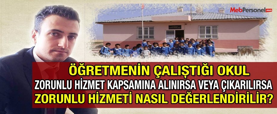 Çoğu zaman öğretmenin görev yaptığı okulun hizmet alanının değişmesinden ötürü zorunlu hizmet sayılan okul bazen zorunlu hizmet kapsamından çıkabiliyor yada tam tersi zorunlu hizmet sayılmayan okul zorunlu hizmet kapsamına alınabiliyor.Bu durumda öğretmenin aklına “Öğretmenin çalıştığı okul zorunlu hizmet kapsamına alınırsa veya çıkarılırsa zorunlu hizmeti nasıl değerlendirilir?” sorusu geliyor.