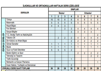 Talim Terbiye Kurulu’nun “İlköğretim Kurumları (İlkokul ve Ortaokul) Haftalık Ders Çizelgesi” Kararına göre 1. Sınıflar 26 saat, 2 ve 3. Sınıflar 28 saat zorunlu ders göreceklerdir. 1. Sınıflar 4 saat, 2. ve 3. Sınıflar 2 saat serbest etkinlikler dersi göreceklerdir.