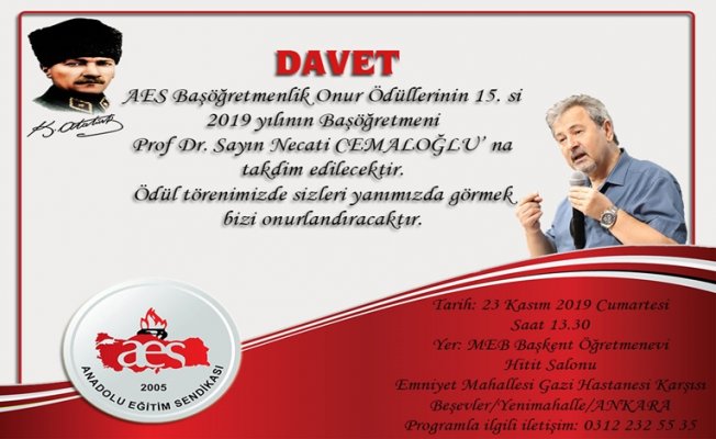 Öğretmen, okul yöneticisi, müfettiş, akademisyen olarak her zaman Başöğretmen Mustafa Kemal Atatürk’ün izinden yürümüş olan Sayın Prof. Dr. Necati CEMALOĞLU; meslek ahlakı ve ilham verici çalışmalarıyla camiamıza örnek olmuştur. 23 Kasım 2019 Cumartesi Günü, Saat 13:30, Başkent Öğretmenevi( Ankara) Hitit Salonunda gerçekleşecek ödül törenimize tüm eğitimciler ve aileleri davetlidir.