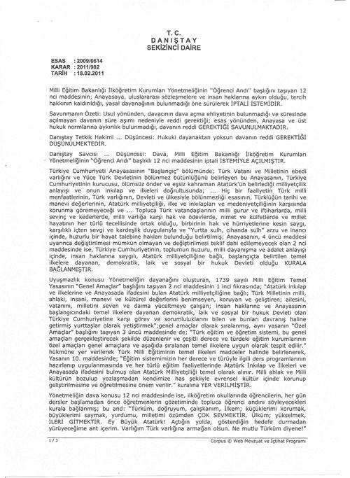 2010 ve 2011 yıllarında verilen iki ayrı kararda, Andımız’ın, “ırkçı söylemler içermediği, “Türk” sözcüğünün de bir ırkın değil milletin ortak adı olduğu belirtilirken, Danıştay Savcısı, dava ile ilgili görüşünde, öğrencilerin bu yüce değerlerle donatılmasında insan haklarına, Anayasaya, Milli Eğitim Temel Kanunu’na, İlköğretim ve Eğitim Kanunu’na aykırı bir durum olmadığını belirterek, “Dünyadaki tüm medeni uluslar, kendi vatandaşlarına, insanlık değerlerini, vatan ve ulus sevgisini öğretmektedir. Bu çerçevede, Öğrenci Andı’nın her gün, Türkiye Cumhuriyeti’nin sınırları içinde bulunan bütün ilköğretim okullarında, yabancı uyruklu öğrenciler kapsam dışında tutularak, okutulmasının Türk ilköğretim sisteminin bir parçası olarak değerlendirilmesi gerekir.” görüşüne yer veriyor.
