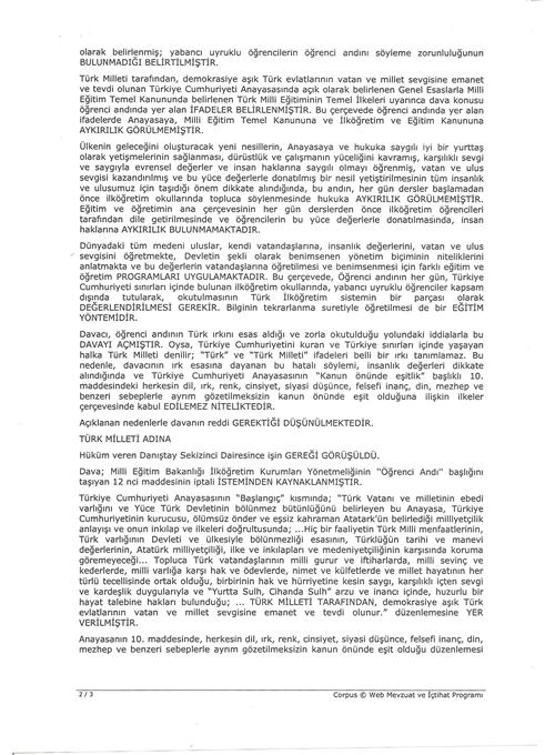 Davacı kişinin, Öğrenci Andı’nın Türk ırkını esas aldığı ve zorla okutulduğu yolundaki iddialarına karşılık Danıştay Savcısı , “Türkiye Cumhuriyeti’ni kuran ve Türkiye sınırları içinde yaşayan halka Türk Milleti denir. ‘Türk’ ve ‘Türk Milleti’ ifadeleri belli bir ırkı tanımlamaz. Bu nedenle, davacının ırk esasına dayanan bu hatalı söylemi, insanlık değerleri dikkate alındığında ve Türkiye Cumhuriyeti Anayasası’nın ‘Kanun önünde eşitlik’ başlıklı 10. maddesindeki herkesin dil, ırk, renk, cinsiyet, siyasi düşünce, felsefi inanç, din, mezhep ve benzeri sebeplerle ayrım gözetilmeksizin kanun önünde eşit olduğuna ilişkin ilkeler çerçevesinde kabul edilemez niteliktedir. Davanın reddi gerektiği düşünülmektedir.” diyerek açılan davanın “Hukuki dayanaktan yoksun” olduğuna kanaat getiriyor.