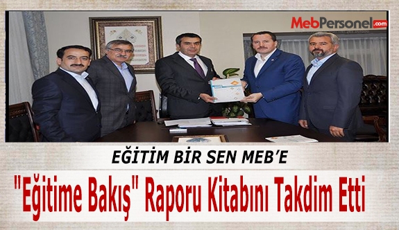 Eğitim Bir Sen MEB’e “Eğitime Bakış” Raporu Kitabını Takdim Etti. Eğitim Bir Sen yöneticileri, bugün Milli Eğitim Bakanlığı’na giderek Eğitime Bakış raporunu kitabını takdim ettiler. Milli Eğitim Bakanı, Milli Eğitim Bakanlığı Müsteşarı ve Milli Eğitim Bakanlığı İnsan Kaynakları Genel Müdürü Hamza Aydoğdu ile görüşen Eğitim Bir Sen Genel Başkan Yardımları Latif Selvi, Hasan Y Yayla ve Atilla Olçum; beraberinde getirdikleri Eğitime Bakış raporu kitabını takdim ettiler.