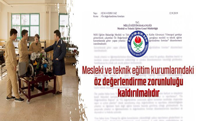 Millî Eğitim Bakanlığı Mesleki ve Teknik Eğitim Kurumları Kalite Güvencesi Yönergesi gerekçe gösterilerek çıkarılan Öz Değerlendirme Uygulama Rehberi gereğince mesleki ve teknik eğitim kurumlarında görev yapan yönetici ve öğretmenlerce “öz değerlendirme formları” düzenlenmesi istenmektedir. Ancak yönetici ve öğretmenlerimiz tarafından düzenlenen bu formların, somut bir gerekçe, düzeltme önerisi ve inceleme sonucu gösterilmeksizin reddedildiği ve yeniden düzenlenmesinin istendiği yönünde sendikamıza çok sayıda şikâyet iletilmektedir.
