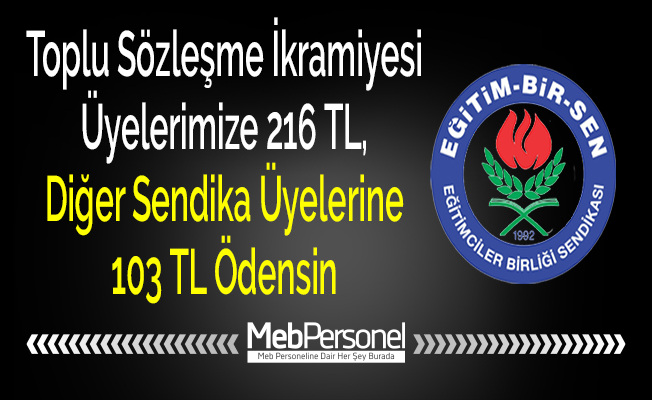 Üç ayda bir 103,84 TL olarak ödenen toplu sözleşme ikramiyesi; yetkili sendika üyelerine 216 TL olarak ödensin.