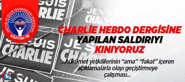 Eğitim-İş olarak, Charlie Hebdo’ya düzenlenen saldırıyı ve saldırganları lanetliyoruz.” denildi.