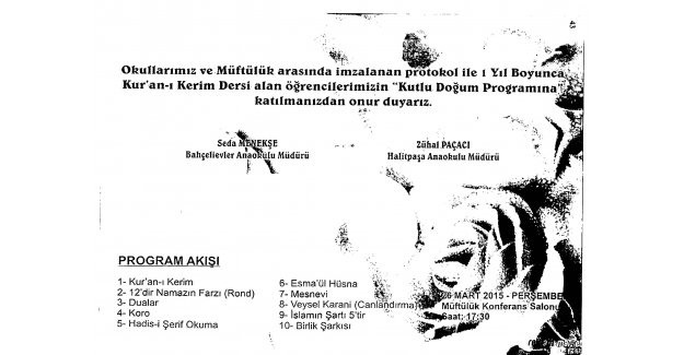 Erzincan`da iki anaokulu müdürünün adıyla yayınlanan duyuruda kullanılan ifade, söz konusu durumun geldiği noktayı gözler önüne sermektedir. Duyuruda, “Okullarımız ve Müftülük arasında imzalanan protokol ile 1 yıl boyunca Kur`an-ı Kerim dersi alan öğrencilerimizin ‘Kutlu Doğum Programına` katılmanızdan onur duyarız.” ifadelerine yer verilmiştir. Programın akışında ise Kur`an-ı Kerim, namazın farzları, dualar, hadis-i şerif okuma gibi başlıklar yer almıştır.
