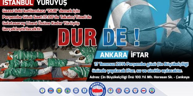 Memur-sen ve İHH öncülüğünde ve bir çok STK’nın katılımıyla Gazze’de yaşanan katliamlara “DUR” demek için Perşembe günü Saat: 17.00’da Taksim/Tünel’den Galatasaray Lisesi önüne büyük bir yürüyüş gerçekleştirilecek. Memur-sen olarak duyarlı bütün sivil toplum, yardım kuruluşları ve milletimizi Gazze’deki katliamlara “DUR” demek için Perşembe günü Saat: 17.00’da Taksim/Tünel’den Galatasaray Lisesi önüne gerçekleştireceğimiz büyük yürüyüşe davet ediyoruz.