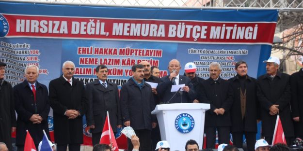 Sabahın erken saatlerinden itibaren alana akın eden kamu görevlileri Sakarya Caddesini hınca hınç doldurdu. “HER YER RÜŞVET, HERYER YOLSUZLUK”, “YOLSUZLUĞA HAYIR”, “AK DEĞİL KARASIN, BAŞIMIZA BELASIN”, “SUSMA HAYKIR ALDATMAYA HAYIR”, “HÜKÜMET KUTUNU AL BAŞINA ÇAL” şeklinde sloganlar atarak yolsuzluğu ve hırsızlığı protesto eden ve memur maaşlarına yapılan zamların yetersiz olduğunu ifade eden kamu görevlileri miting boyunca susmadı.